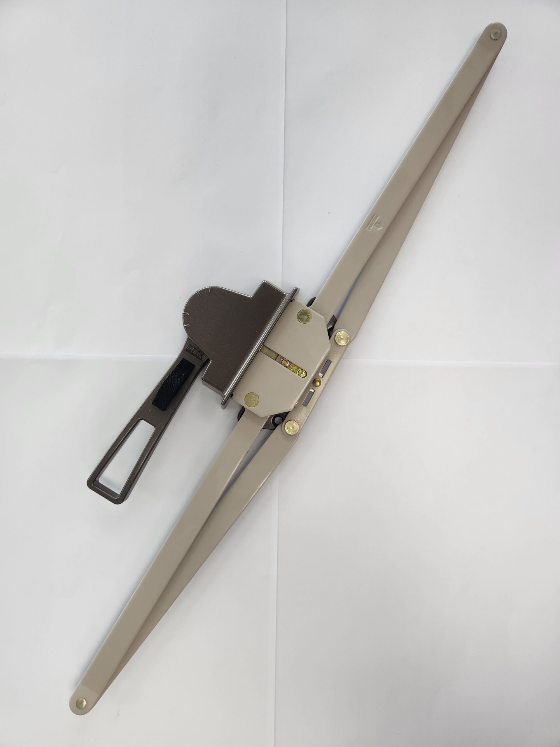 Bronze-finished operator tailored for awning windows, allowing quick opening and closing, with the ability to lock a window in 5 distinct positions, and includes a release clip for immediate sash detachment. The 180° lever action simplifies sash handling, and its cam-action promises a secure fit, part# 17cb25lh, bronze finish